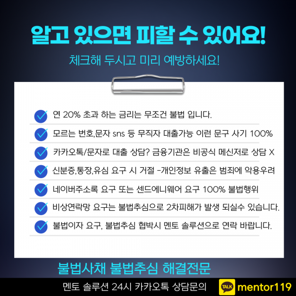 불법사금융 피해 예방 방법 페이지 정보 작성자 관리자 작성일25-08-31 21:08 조회417회 댓글0건 이전글 다음글 목록 본문 사채 빛 독촉?이제 그만!불법사채의 시작, 고민하면 늦습니다불법사채 불법추심으로 인해 피해 고통 받고 계신분들께멘토솔루션에서 확실하게 해결 해드리겠습니다. 이전글 다음글 목록